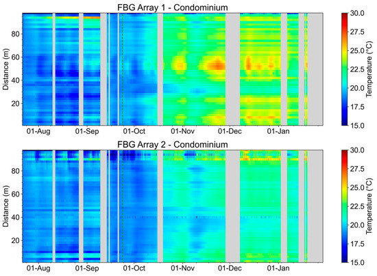 Figure 30 shows the evolution of the temperature measurements of the condominium’s FBG Array 1, and FBG Array 2’s temporal evolution. It is possible to verify a direct relationship between the increase in environmental temperature and the temperature measured in the ducts. During the evaluated period, no temperature increase or decrease events were detected without a direct correlation to the environmental temperature variation. It is noticeable the day/night temperature variation for FBG Array 2 in the upper portion of Figure 30 corresponds to FBG46 to FBG50 placed outside the duct under Transformer 2.