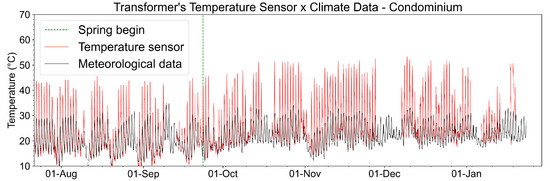 Figure 31 shows the temperature measurements performed on the surface of Transformer 1 during the analysis period. The transformer temperature variations are mainly linked to the environmental temperature variation for seasonal and daily periods, as can be shown in Figure 31 (for example, the increase in temperature after the beginning of the spring, as indicated by a dotted green line).
