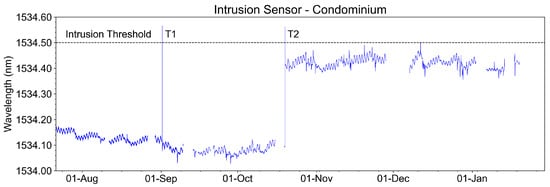 Recovered wavelength of the intrusion sensor at the condominium with two intrusion test events in earlier September, event T1, and late October, event T2.