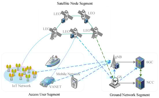 The fifth generation (5G) of wireless communication technology has promoted the development of the Internet of Things, automatic driving, virtual reality [1], etc. However, challenges still exist [2,3]. Although the terrestrial network has developed unprecedentedly, the seamless coverage of global heterogeneous networks has not been achieved. It is difficult for users to enjoy high-quality network services in many underserved areas (such as mountains, oceans, etc.) and in more than 50% of countries [4]. Oriented toward the 6G network, satellite–ground integrated networks (SGIN), which could provide global coverage and integrated management of satellite and terrestrial networks, have become a hot topic of current research [5,6,7]. In recent years, Amazon, SpaceX, and other major manufacturers are making great efforts to build satellite networks, which are expected to form a satellite communication system with a network capacity of 10 Tbps [8], providing reliable communication services for SGIN. With 6G, satellites will obtain more computing power through mobile edge computing (MEC) [9] and they will therefore be able to undertake heavier computing tasks.