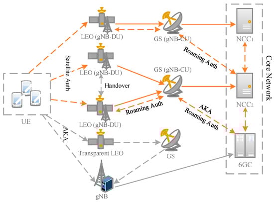 The protocol model of the SGIN is shown in Figure 2. The protocol involved in this paper is represented by orange lines. The dashed lines mean that the channel between two entities is insecure, and the solid lines are the contrary. The UE, connected to the satellite, can access the NCC through the two protocols designed in the following section. In addition, since regenerative satellites are equipped with gNBs, the UE can also access the 6G core network through regenerative satellites, transparent satellites, or gNBs, using the AKA protocol. When it is necessary to handover satellites due to their movement, the satellites plan the handover strategy independently. This process is transparent to the UE. When the UE needs to roam between networks of the same operator or roam across the networks of different operators, they have to use the protocols of the presented roaming authentication phase according to the situation. The protocol architecture aims to address the required access methods and performance for heterogeneous terminals.