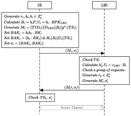 The traditional short group signature scheme uses a batch group signature (BGS) to complete batch authentication. However, due to the insufficient computing power of some devices in 6G heterogeneous networks and the massive terminals, we designed a novel batch authentication protocol to meet the needs of these terminals. In this scenario, users can generate a TID, but it is traceable. A set of UE send their batch authentication message to the LEO, which authenticates all parameters uniformly. If the first batch authentication is successful, the LEO authenticates them and continues the authentication process. If the first authentication fails, a rebatch is required. The specific protocol process is shown in Figure 4, and the detailed steps are as follows: