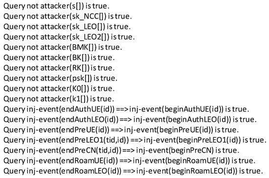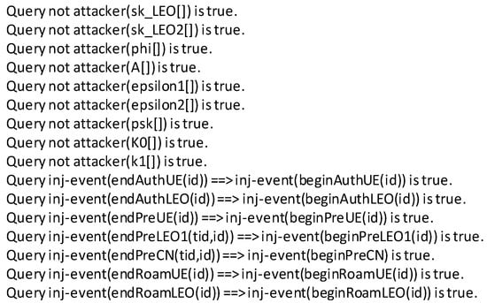 Suppose an attacker tries to imitate a legitimate UE, it must have the UE’s group private key , batch private key , or roaming parameters in order to generate a valid signature. However, these private keys are only held by the UE and NCC. It is difficult for the attacker to obtain both private keys. The LEO’s private key is only held by the LEO and NCC. If the attacker uses the wrong private key signature, the UE will verify the signature and the validation will fail. In the roaming authentication phase, the attacker needs to obtain the , modify the information in the token, and send the token to the UE through the established secure channel to complete the attack. This is also difficult for the attacker.