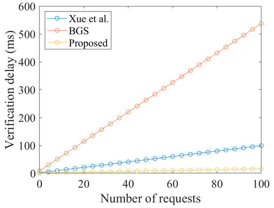 In the evaluation of first batch verification, we compared the proposed scheme with the related works of Xue et al. [11] and Wasef et al. [12]. In order to contrast with the unlinkable authentication scenario, we compared with the work of Wasef et al. [12], based on a batch group signature (BGS). The cost of signing and verifying are shown in Table 4. Although the computational complexity of the signature of the proposed scheme was higher than that of Xue et al.’s work, Xue et al. [11] used a UE private key to complete the signature, and the LEO needs to use the UE’s public key to verify the signature. This is detrimental to the privacy protection of the UE, as attackers can easily trace the UE through its public key. Therefore, based on security and privacy considerations, our scheme is more suitable for the proposed SGIN scenario. Additionally, Figure 8 shows that the verification cost of the three schemes varies with the increase in the number of authentication requests. It can be seen that the cost of the proposed scheme is significantly less than that required for BGS and the work of Xue et al. [11].
