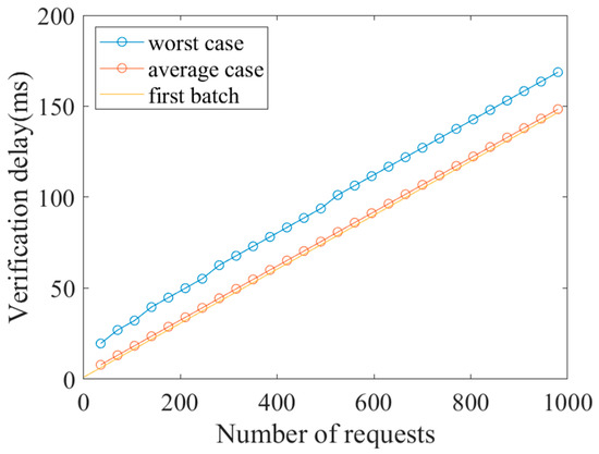 Figure 9 shows the total validation complexity for the worst case, average case, and first batch authentication with 0 to 1000 UE requests. As can be seen from the figure, although the complexity of rebatch authentication in the worst case is relatively high, the cost of rebatch authentication in the average case is close to the complexity of the initial batch authentication, and the computational complexity does not increase rapidly with the increase of the number of requests. Considering the possibility of DoS attacks leading to large-scale UE authentication failure, rebatch authentication is necessary.