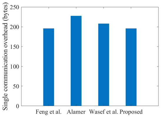 In the unlinkable authentication scenario, the UE needs to send an LEO signature of = 144 bytes and plaintext of = 52 bytes. When the LEO completes authentication, 84 bytes of information will be returned. The signature information for the schemes of both Feng et al. [37] and Wasef et al. [12] was = 144 bytes, while the schemes of Alamer [24] required = 192 bytes. Since other SGS-based schemes have different architectures from the proposed scheme, we tried to unify their certification scenarios and situations for a better analysis. It was assumed that at least the ID and time stamp are required in these schemes. The trust value of the scheme of Feng et al. [37] was 4 bytes according to their article. A comparison of communication overhead from the UE to the access point is shown in Figure 10. As can be seen from the figure, the communication overhead of the proposed scheme was slightly smaller than the schemes of Alamer [24] and Wasef et al. [12], while it was equal to Feng et al. [37].