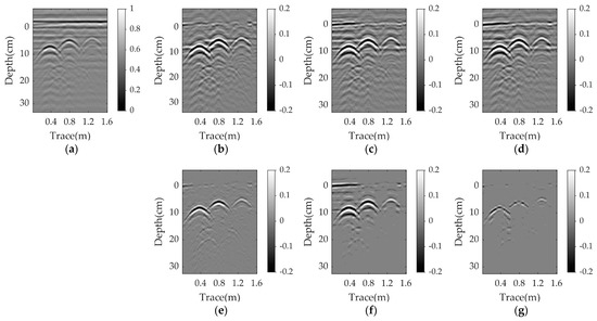 - Solimene, R.; Cuccaro, A.; Dell’Aversano, A.; Catapano, I.; Soldovieri, F. Ground clutter removal in GPR surveys. IEEE J. Sel. Topics Appl. Earth Observ. Remote Sens. 2014, 7, 792–798. [Google Scholar] [CrossRef]