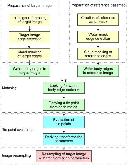 The proposed method does not consider rotation for each water body separately, and the geometric resolution of a tie point is limited to a pixel. The results presented in