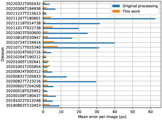 Figure 6, which presents a comparison between the mean error per image from the original processing and from the proposed method. There are only two cases in which the proposed method led to larger errors than in the original processing, but the absolute values of these errors are rather small (