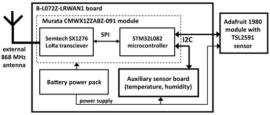The remote light measuring device, developed by the authors, is based on the B-L072Z-LRWAN1 board with the Murata CMWX1ZZABZ-091 processor. This processor integrates a low-power STM32L081 micro-controller and a Semtech SX1276 wireless transceiver compatible with the LoRaWAN standard. An Adafruit 1980 sensor board is used with the TSL2591 Lux sensor (Figure 3, left). The sensor communicates with the processor via I2C serial bus. The board is expanded with an auxiliary sensor board with temperature and humidity sensors to monitor the device during long-term outside operation for abnormal temperatures and leaks. The block schematic of the device is presented in Figure 5.