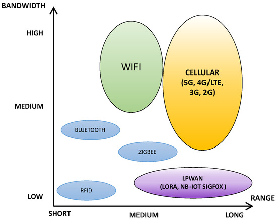 The current development of Internet of Things (IoT) devices [28] is associated with the 4.0 industrial revolution [29], which has been progressing for over ten years. IoT devices are often referred to as “smart” solutions in the context of their use—most often as sensors for monitoring certain physical quantities, e.g., for buildings, urban infrastructure or healthcare applications, etc. IoT devices should generally be characterized by low energy consumption and, thus, not too much computing power. IoT devices’ small size and low production costs are also desirable (mainly due to the mass production of this type of device). Another critical aspect of IoT devices is the type of communication interface involved. The most common type of communication is wireless communication. There are many variations in communication protocols used in IoT devices. The most popular protocols include Bluetooth [30], Zigbee [31] Wi-Fi [32], based on GSM networks (2G, 3G, 4G, 5G) [33], NFC [34] and others. An important aspect of such a communication protocol is the bandwidth-to-range ratio. Figure 7 lists the most popular communication protocols used in IoT devices, taking into account their bandwidth and range.