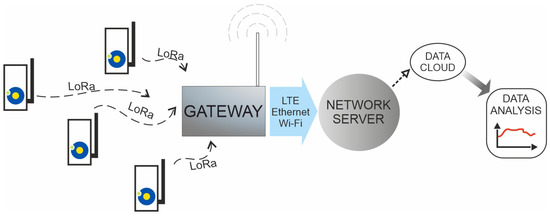 The Sigfox [35] and LoRaWAN [36] protocols, which are characterized by very long ranges (distance of kilometers) and low energy consumption during use, are particularly noteworthy. Such networks based on these communication protocols are called Low-Power Wide Area Networks (LPWANs). In the devices described in the article, the authors decided to use a network based on LoRaWAN (Long-Range Wide-Area Network), a long-range standard that uses a low data rate with low power consumption needs.