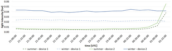 Comparison of measured light intensity for device 1 and 2 in summer and winter (average across all nights).