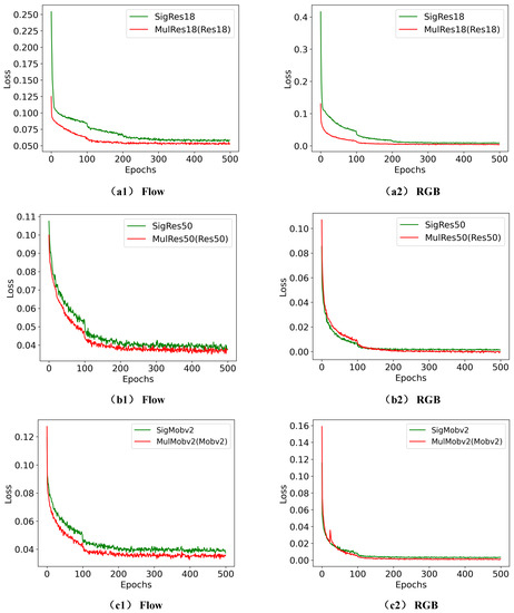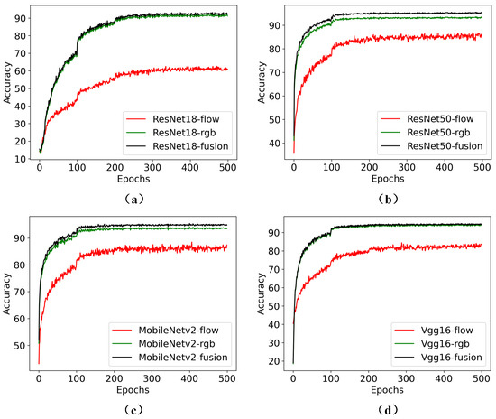 Furthermore, to provide readers with a more intuitive understanding of the two-stream network, we include Figure 5. These figures illustrate the accuracies and losses of the RGB, flow, and two stream settings of different basic models at various epochs. Here, of Figure 5a denotes the comparison results based on ResNet18; Figure 5b indicates the comparison results based on ResNet50; Figure 5c represents the comparison results based on MobileNetv2; Figure 5d is the comparison results based on Vgg16.