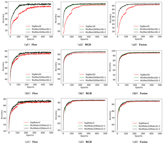 Specifically, (a1)/(a2)/(a3) of Figure 6 represent the accuracy of the RGB/flow/fusion stream on the SigRes18 and MulRes18(Res18) models under different epochs; (b1)/(b2)/(b3) of Figure 6 present the accuracy of the RGB/flow/fusion stream on the SigRes50 and MulRes50(Res50) models under different epochs.