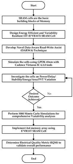 Monte Carlo analyses were carried out using 5000 samples for all cells to understand the behavior and variability. From the mean and standard deviation results, variability is determined for read/write power, leakage power, leakage current, read/write current, and read/write delay time. The variability comparison was widely investigated to validate the resilience and robustness of the proposed SRAM. Next, the layout area was analyzed and presented. Finally, the electrical quality metric was found to confirm the overall performance of the proposed SRAM cell. Figure 1 shows the flow chart of the research methodology.