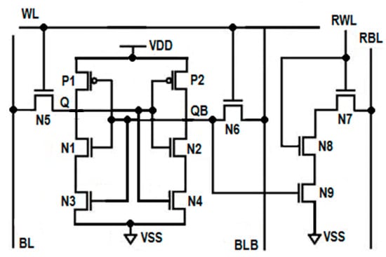 As shown in Figure 2, the single-ended read operation is performed by the independent read circuit, which is designed with three series connected NMOS transistors N7, N8, and N9. These three series connected transistors are further connected to the read bit line (RBL). The gate of transistor N9 is controlled by storage node QB, whereas the switching behaviors of transistors N7 and N8 are controlled by the read word line (RWL). During the write operation, RWL = 0, which disconnects the read circuit from the write circuit due to the OFF transistors N7 and N8, improves read stability. When QB = 0 and RWL = 0, all of these three series connected transistors turn OFF and offer very high resistance from RBL to the ground; thus, the leakage current is almost zero. This stack effect effectively controls the power consumption during the write operation. The isolation of the read circuit from the write bit lines enhances the read static noise margin (RSNM). During read 0 operation, due to OFF transistor N9, the current from RBL to the ground is limited, which reduces read dynamic power consumption.