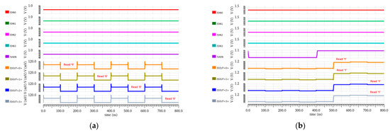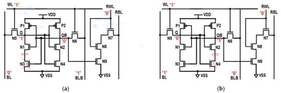 When QB is holding output ‘0’, the NMOS transistors N7 and N8 in the read path are turned ON, whereas the last N9 transistor is OFF, which disconnects the RBL from the ground. The open read path presently does not allow the read bit line (RBL) to discharge; hence, it maintains its pre-charged voltage of 1 V, which is equivalent to read 1 operation. This voltage level is interpreted as logic 1 by a sense amplifier, which is equivalent to the read 1 operation. The absence of discharging activity on the RBL saves the dynamic power consumption during the read 1 operation. The OFF transistor in the read 1 path also restricts the leakage current and reduces static power consumption as well. The resulting circuit for the read 1 operation is shown in Figure 3a.