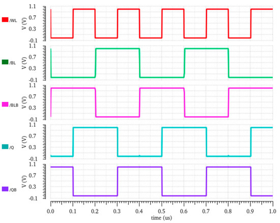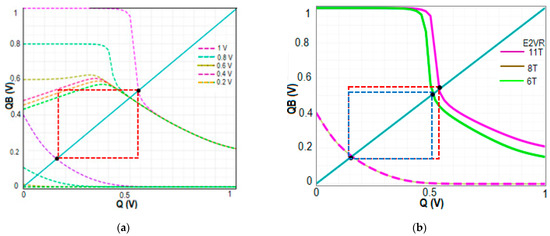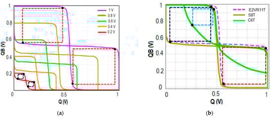 The proposed E2VR11T cell was designed and implemented into 45 nm complementary metal oxide semiconductor (CMOS) technology. The device size has been evenly applied to NMOS and PMOS transistors for a fair and reasonable comparison. Device sizes of 120 nm/45 nm and 150 nm/45 nm have been used for all the NMOS and PMOS transistors, respectively, for the proposed and all the comparative SRAM cells as well. This combination of device sizing provides the nominal voltage transfer characteristics (VTC). The supply voltage of 1 V at 27 °C temperature is applied for all the operations.