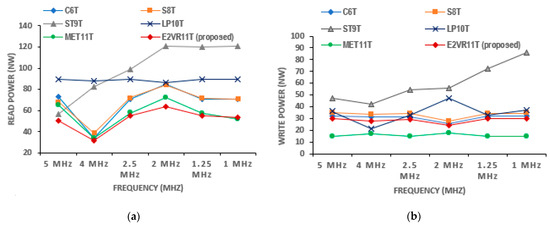 Dynamic power of cells versus frequency; (a) read power; (b) write power.