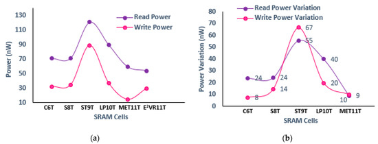 Power consumption of cells; (a) read and write power; (b) variation in read and write power against proposed E2VR11T cell.