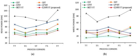 The read and write power simulation results taken from all process corners, voltage variations, and temperature variations are plotted in Figure 10, Figure 11 and Figure 12. The threshold voltage always changes due to the inter-die variations; hence, the power, performance, and stability are normally affected [31,32]. It can be observed from the plot that the proposed cell has the lowest read power in all of the process corners. The cell performs better in all the corners compared to other cells and improves the read stability and write ability. The average read power, 54.33 nW, of the proposed cell is again lower than all other cells in all of the process corners. The write power of the proposed cell is extremely low in the FF corner, which confirms that the cell is stable under the worst conditions as well. The MET11T has the lowest write power in all process corners.
