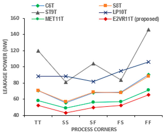 PVT (process, voltage, temperature) variation highly influences the behavior of SRAM cells in terms of power, switching speed, stability, and performance [26,27]. The transistor’s propagation time is determined by simulating PVT variation. A comprehensive analysis of PVT variations is carried out for all of the operations of the proposed and other comparative cells.