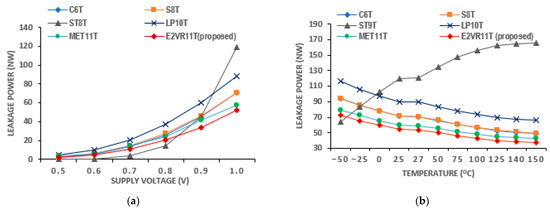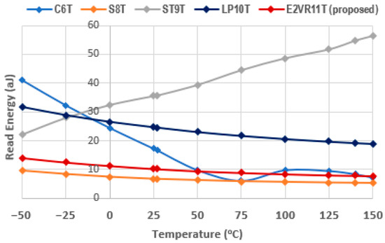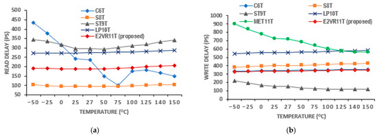 The plot of various temperatures ranging from −50 °C to 150 °C is shown in Figure 12. The proposed cell demonstrates the least write power at all temperatures and the second lowest for read operation after the MET11T cell. There is an improvement of 7.26%, 14.12%, 72.11%, and 18.77% as compared to the proposed cell’s 28.52 nW power for the write operation. The average read power of the proposed cell at all temperatures is 50.97 nW and lower by 23.59%, 24.10%, 60.56%, 40.31%, and 9.92% over C6T, S8T, ST9T, LP10T, and MET11T cells, respectively. This lesser sensitivity of the power against temperature in the proposed cell is due to the isolated read circuit that controls the leakage current effectively. From these results, it can be concluded that the proposed E2VR11T cell is PVT-compliant in terms of power consumption.