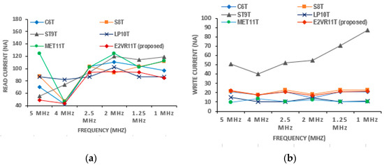 The power consumption of conventional C6T and standard 8T cells are quite high due to their bit line discharging activities. However, in the proposed E2VR11T SRAM cell, less power is consumed due to the lower discharging activity at bit lines. The dynamic power for both read and write operations are measured for proposed E2VR11T and other published cells for varying frequencies from 1 MHz to 5 MHz, as plotted in Figure 8. The proposed cell exhibits an average read power of 23.40%, 23.90%, 47.15%, 43.41%, and 8.84% lower than C6T, S8T, ST9T, LP10T and MET11T cells. The lower read power is due to lower discharging activity at RBL and the restricted leakage current. The average write power is also lowered by 7.80%, 14.68%, 67.28%, and 24.06% over C6T, S8T, ST9T, and LP10T cells. It can be observed from the graph that the proposed E2VR11T cell dissipates the lowest power for the read operation at all of the stipulated frequencies among the cells, and the write power is also lower, except for the MET11T cell when compared to the other cells.