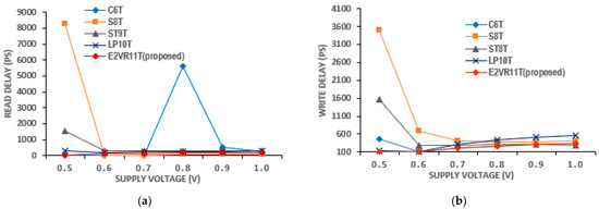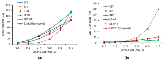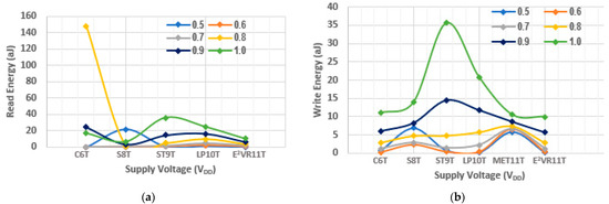 The proposed E2VR11T cell dissipates less power due to lower discharging activity at the read and write bit lines. Both the read and write power of all of the cells is measured at 1 μs transient time and is plotted in Figure 9. It can be observed from the plot that the proposed cell dissipates the lowest read power among all of the cells. The lowest read power is caused by independent and single-ended read operation in the E2VR11T cell. The NMOS transistors, N7, N8, and N9, which are connected in series on the read path, perform quick read operation using RBL, which enables a power reduction. The read power is reduced by 23.87%, 24.19%, 55.42%, 39.94%, and 9.09% with a supply voltage of 1 V as compared to C6T, S8T, ST9T, LP10, and MET11T cells. This reduction is due to the stack effect as well as lower discharging voltage at the RBL, which reduces both static power as well as dynamic power.