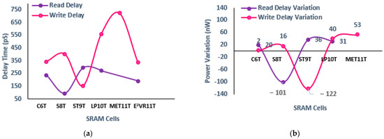 Traditional cells, such as conventional C6T and standard S8T cells, are industry-standard architectures [20,21] that are normally used to benchmark the performance of SRAM memory circuits. However, these cells suffer from conflict between write and read operations, stability degradation, write failures, half select issues, etc. Moreover, if the read static noise margin is improved in terms of read stability, then it could affect the write operation. It has also been forecasted by researchers that process variation may limit the required minimum voltage for read and write operations [18,24]. Researchers have proposed several SRAM topologies with improved outcomes when compared to traditional topologies [11,12,13,14,15].