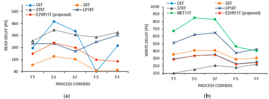 The process variation is investigated at all process corners, namely nominal or typical–typical (TT), slow–slow (SS) corner, slow–fast (SF) corner, fast–slow (FS) corner and fast–fast (FF) corner for read, write operations, and compared with other considered cells. The process corner simulations are useful for identifying the parametric variation at the extreme level [28].