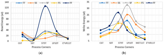Process variation on power consumption of cells; (a) read power; (b) write power.