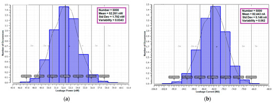 Power consumption is a critical requirement for low-power applications as it executes many simultaneous applications that demand operational speed and overall system performance [29]. The power consumption of an SRAM device is approximately 80% of the system’s total power. The dynamic power and leakage power consumption of an SRAM and its connected devices are measured and analyzed to assess the overall memory performance. The dynamic power is highly influenced by the switching and supply voltage during the read–write operations due to the charging and discharging of capacitors. The dynamic power relationship can be defined by using [30]: