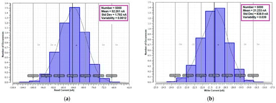 Monte Carlo simulation (5000 samples) of current variability plot of E2VR11T; (a) read current; (b) write current.