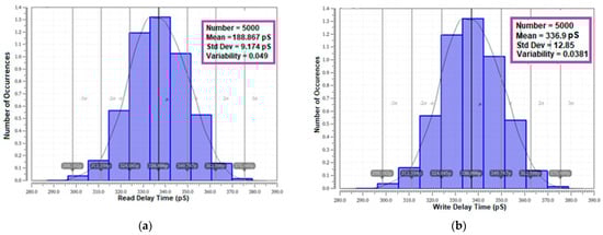 Monte Carlo simulation (5000 samples) delay time variability plot of E2VR11T; (a) read delay time; (b) write delay time.