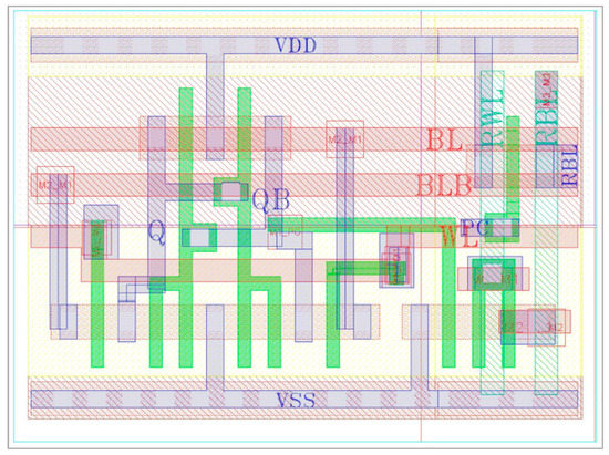 In this work, the conventional C6T [20], standard S8T [21], Schmitt trigger ST9T [22], low-power LP10T [23], and multi-bit-error-tolerant MET11T [24] have been selected for comparison and benchmarking. All of the cells are designed at the schematic and at the layout levels using 45 nm technology and simulated to compare the results against the proposed E2VR11T cell. The operational specification of the selected cells, including the proposed cell, is highlighted in Table 1. The ongoing research confirms that the SRAM memory design and development is still progressing despite the many different cells with various applied techniques. Characteristics such as energy efficiency and process tolerance are very important for SRAM memory in terms of low-power applications.