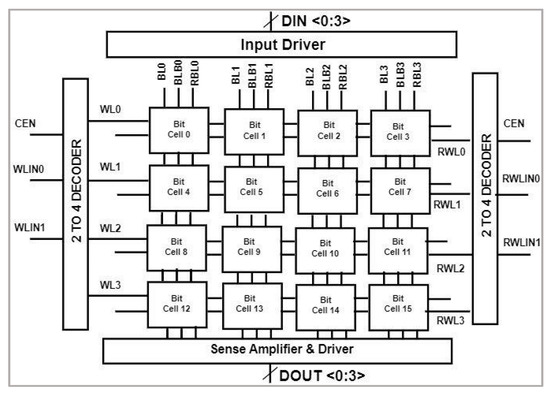 Block diagram of 4 × 4 memory array with peripheral circuits.