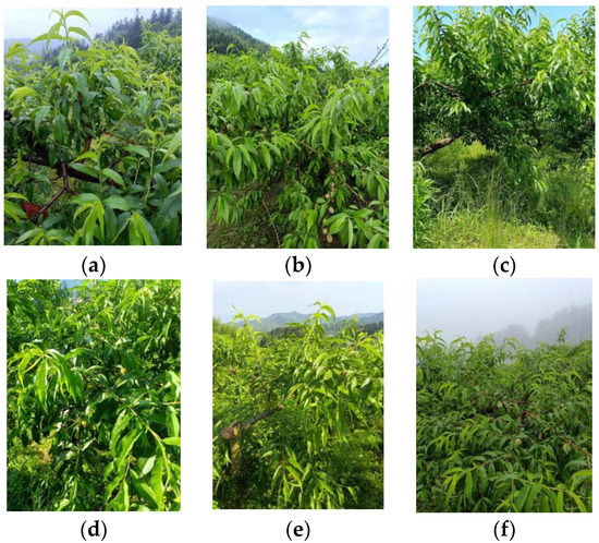 The data on the mature yellow peaches were collected from the yellow peach plantation in Daping Village, Jinggangshan City, Jiangxi Province, and the photographs were taken between 10 April 2022 and 10 May 2022, when the yellow peaches were already fruiting and growing and about to be bagged. To achieve accurate bagging and fruit thinning management, growers needed to accurately count the number and know the position of yellow peach fruits at this stage. The shooting device was an OPPO A93S mobile phone with a resolution of 4000 pixels by 3000 pixels. To improve the generalization ability of the model, the angle and distance of the shots were not required. After eliminating images that clearly did not meet the requirements (e.g., blurred, shaky), the number of images obtained reached 1021, covering different environments (e.g., morning, midday, evening) and weather conditions (e.g., sunny, cloudy, rainy, etc.). Figure 1 shows the images captured under different environments in the dataset.