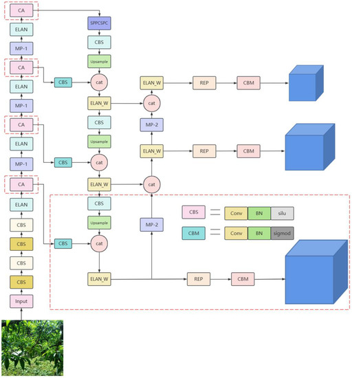 Although the traditional YOLOv7 algorithm is powerful, its detection of immature yellow peaches is unsatisfactory. The missed and wrong detection mainly occurs in the case of small target detection and severe occlusion. Considering this situation, in this paper, we redesigned the anchor frame to suit the characteristics of the yellow peach dataset. The appropriate anchor frame size can quickly match the yellow peach to improve the detection effect and added the CA module to the backbone network, which allows the network to focus on more information about the yellow peach to remove redundant leaf interference information and enhance the feature extraction for the original image. The p2 detection layer for small targets is introduced. The convolutional network is prone to loss of small target information during information transfer, but the addition of the p2 detection layer can retain more small target information and transfer the information deeper into the network to improve the detection effect. The loss function is also replaced with EIoU to speed up the convergence rate, and the improved algorithm is called YOLOv7-Peach, and its structure is shown in Figure 5.