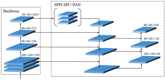 The YOLOv7 algorithm is one of the more advanced target detection algorithms available. The network structure of YOLOv7 follows the overall layout of the YOLO series, which can be roughly divided into three parts: the spine, the backbone, and the neck. The specific structure is shown in Figure 4. From the input side of the network, images are adaptively scaled, and then the image information is input into the network. The ELAN structure is divided into two branches, the first one going through an 11 convolution for the channel number change, but the second one going through an 11 convolution module for the channel number change first, and then through four 33 convolution modules for the feature extraction, and finally these four features are superimposed together to obtain the final feature extraction result. The MP-1 structure has two branches, the first one going through the MaxPool for a downsampling and then an 11 convolution for the channel number change, but the second one going through an 11 convolution for the channel number change and then through a convolution block with a 33 kernel and a step size of 2 for a downsampling. Finally, the results of the two branches are added together to obtain the final downsampling result. The neck section contains the PANet (Path Aggregation Network) and SPPSCPC (Spatial Pyramid Pooling Cross Stage Partial Concat) modules. Top-down aggregation of the high-layer feature information with the output features of the ELAN module in different layers is conducted, followed by bottom-up aggregation of the shallow-layer features through a bottom-up path aggregation structure, thus fully fusing the image features of different layers. The SPPSCPC (Spatial Pyramid Pooling Cross Stage Partial Concat) module is divided into two branches, the first one changing the channel number through three CBS modules, and then going through four MaxPool branches for processing and tensor splicing, and then changing the channel number through two CBS modules, but the second one going through the CBS module. Finally, the features of the first branch are fused with those of the second one, which then goes through a CBS module for the channel number change [20].