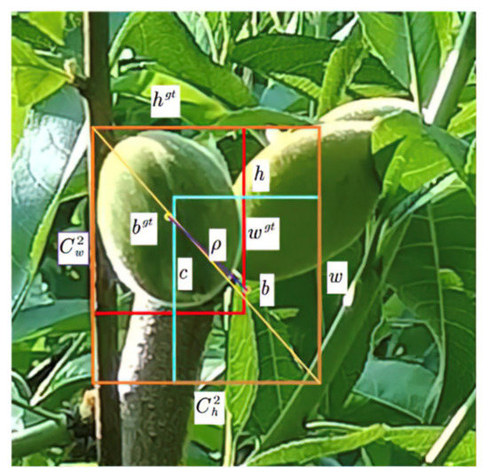 The loss function is the key to the convergence of a deep learning model. Many current target detection algorithms use the joint intersection (IoU) as the loss function for the reason that the intersection ratio presents the error between the prediction frame and the true frame, directly affecting the prediction effect. The higher the value of the loss function, the greater the direct error between the prediction frame and the true frame. However, when there is no intersection between the prediction frame and the true frame, then the loss function does not reflect the problem correctly. To make the prediction frame closer to the true frame and improve the detection effect as well, the original CIoU loss function of the YOLOv7 was replaced, and the efficient joint intersection (EIoU) was used as the loss function in the yellow peach dataset. The basic principle is shown in Figure 8 [25].