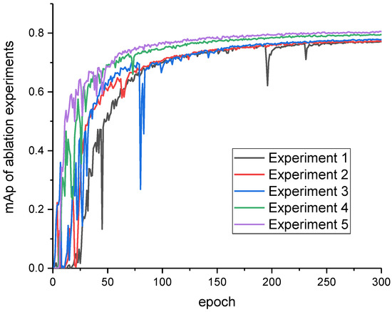 The accuracy variation of the mAp on the dataset for the ablation experiments and the training variation process are shown in Figure 9. As Figure 9 shows, after reaching one hundred rounds of training, each experiment tended to be smooth. When looking at the variation in the data for Experiments 5 and 4, there was a large fluctuation in Experiment 4 at around 80 rounds, while Experiment 5 had a smaller fluctuation. The addition of the small target detection layer allowed the network to detect objects as small as 4 × 4 pixels, which was a significant improvement for small target detection, and the replacement of the detection layer was better for network training with less variation in the network accuracy. Comparing Experiment 4 with Experiments 1, 2, and 3, it could be seen that the accuracy curve for Experiment 4 was significantly higher than the other curves, indicating that the addition mechanism of the attention module improved the network’s effectiveness significantly, produced better detection results in complex image contexts, and enhanced the extraction of the target information. Observing Experiment 3 and Experiments 1 and 2, the best results were reached faster by adding the EIoU to speed up the convergence in the first 50 rounds or so.