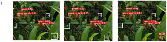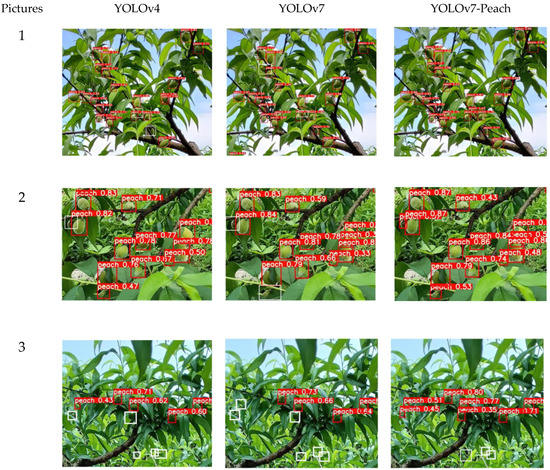 Usually, the accuracy of the detection algorithm decreases when the target is obscured, especially when the YOLO algorithm is weak in severe occlusion. In the current growth phase, yellow peach trees have denser foliage and the occlusion occurs from time to time. To verify the effectiveness of the YOLOv7-Peach in detecting heavy shading, three heavily shaded images were randomly selected from the test set, and detected by using the YOLOv4, YOLOv7, and YOLOv7-Peach, respectively. The detection effects are shown in Figure 11.