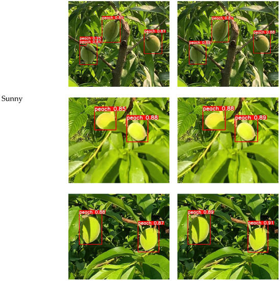 The actual detection of yellow peaches is prone to interference from various environments, such as weather and lighting conditions, which requires a strong robustness of the algorithm to ensure the accuracy of the detection results in the presence of interference. The algorithm was tested on rainy, cloudy, and sunny days to contrast various detection results of the YOLOv7. The results are shown in Figure 12.