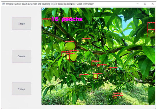Based on the proposed algorithm, this paper uses PYQT5 to write a yellow peach detection application, which can complete the detection and quantity count of unripe yellow peaches. The software supports picture input, video input, and real-time camera input, and the program interface is shown in the figure below.