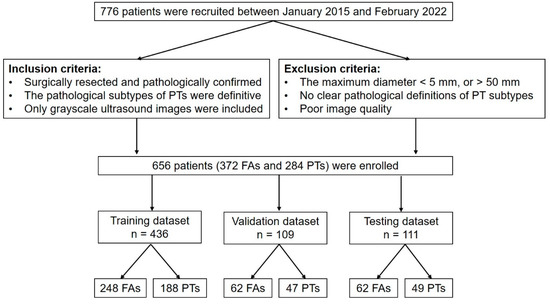 This retrospective study was approved by the institutional review board of Fudan University Shanghai Cancer Center, which waived the need for informed consent. From January 2015 to February 2022, 656 female patients with the same number of breast lesions (372 FAs and 284 PTs) were retrospectively reviewed for US images and pathological results. Among the 284 PTs, 134 cases were benign PTs; 120 cases were borderline PTs; and 30 cases were malignant PTs. The demographics and clinical characteristics are summarized in Table 1. The inclusion criteria were as follows: (1) all cases were surgically resected and pathologically confirmed; (2) the pathological subtypes of PT (i.e., benign, borderline, and malignant) were definitive; and (3) only grayscale ultrasound images were included. The exclusion criteria were as follows: (1) patients with a maximum tumor diameter less than 5 mm or more than 50 mm [23]; (2) no clear definitions of benign, malignant, and borderline lesions in the pathological diagnosis of PTs; and (3) poor image quality.