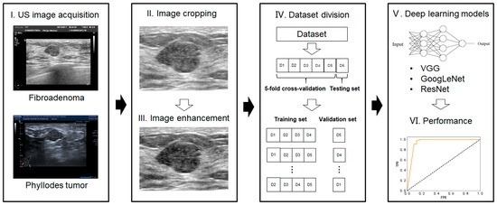 - Image cropping—in order to avoid the influence of nontumor areas in US images and reduce the computational load, the rectangular ROIs (regions of interest) were manually cropped from raw US images.