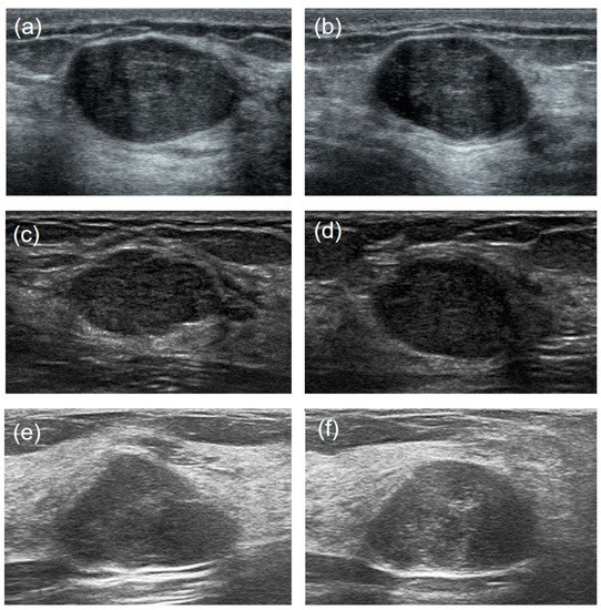 The three imaging modalities, i.e., ultrasound (US), magnetic resonance imaging (MRI), and mammography, are considered the main preoperational diagnostic methods for breast diseases. USs are more commonly used in China thanks to the high density of breast tissues among Asian women [8]. The US characteristics have been valuable in the differentiation between PTs and FAs. Previous studies suggested that the internal cystic areas and heterogeneous inner echo were typical US features for PTs [9,10]. However, in daily clinical practice, a small and benign borderline or malignant PT can be easily mistaken for an FA, whereas large-volume FAs may show similar visual US features to those of PTs. Although combining certain clinical information and typical sonographic features may raise the confidence of diagnosis, it is still challenging to make a reliable differentiation between PTs and FAs with the naked eye. Moreover, these radiological evaluations are always subjective and lack quantitative metrics. Beyond the imaging diagnosis, cytodiagnosis also encounters difficulty in distinguishing PTs from FAs, because of overlapping pathology features, especially for low-grade PTs [11,12].