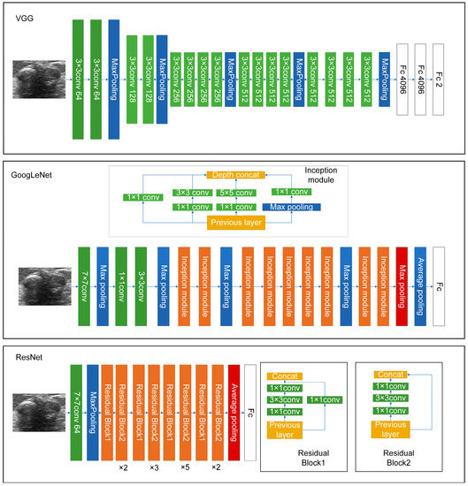 It is hard to differentiate PTs from FAs because of the high visual similarity in grayscale images of them (see Figure 3 and Figure 4 for representative US images). In order to achieve an optimal image classification, three deep-learning models, including ResNet [24], VGG [25], and GoogLeNet [26], were applied. ResNet was constructed by using residual building blocks, which can effectively solve the problems of gradient disappearance and explosion in convolutional neural networks (CNNs). VGG used a 3 × 3 convolution kernel to stack the neural network and thus deepen the whole neural network. Using a smaller convolution kernel and increasing the depth of the convolutional neural network can improve the performance of the model. GoogLeNet introduced an inception structure (fusion of feature information with different scales) and used a 1 × 1 convolution kernel for dimensionality reduction and mapping. At the same time, the full connection layer was discarded, and the average pooling layer was used, which greatly reduced the model parameters compared with those of VGG. The architecture of the three deep-learning models is shown in Figure 5.